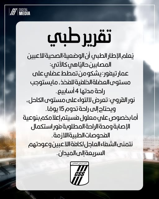 أعلن النادي الصفاقسي، في بلاغ نشره عبر صفحته الرسمية على فايسبوك، عن آخر التطورات المتعلقة بالحالة الصحية لعدد من لاعبيه المصابين، والتي جاءت كالآتي: