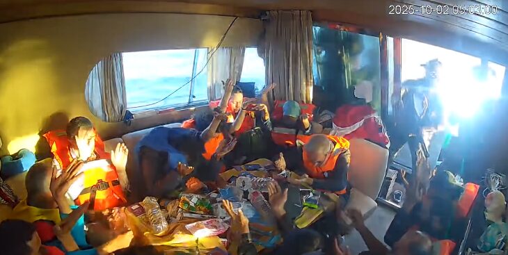وأظهر مقطع فيديو تم نشره على مواقع التواصل الاجتماعي لحظة اقتحام الصهاينة السفينة، شاهرين أسلحة في وجوه ركّابها قبل مطالبتهم بتسليم هواتفهم.