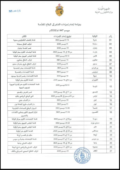 أعلنت وزارة الشؤون الدّينية أن تسعيرة الحج لموسم 1447هـ / 2026 م حدّدت بـ 20.930.000 د وفق التفصيل التالي: