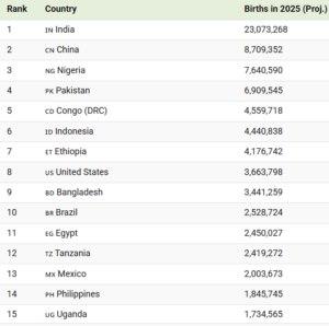 L’Afrique est la région du monde où la croissance démographique est la plus rapide, ce qui s’explique par des taux de fécondité élevés et une population jeune sur une grande partie du continent. Le Nigéria se distingue particulièrement avec 7,6 millions de naissances en 2025, soit plus que l’ensemble de l’Europe, qui devrait enregistrer environ 6,3 millions de naissances.
