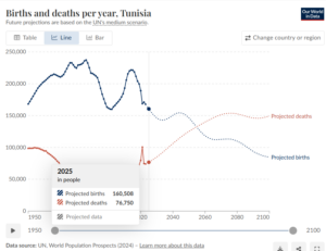 En 2025, et selon les projections de « Our World in Data », la Tunisie a enregistré 160.508 naissances et 76.750 décés, soit une croissance de la population de 84.000 habitants. Ces chiffres sont des projections calculés sur la base d’un rythme de croissance annuel