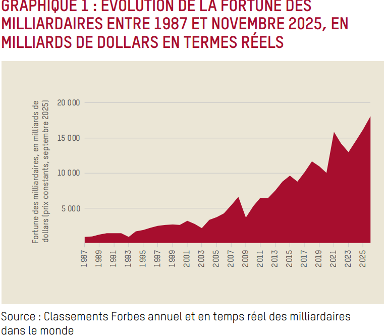 Dans un nouveau rapport publié aujourd’hui par Oxfam à l’occasion de l’ouverture du Forum économique mondial à Davos, on apprend que la fortune des milliardaires a bondi de plus de 16 % en 2025, soit trois fois plus vite que la moyenne des cinq années qui ont précédé, pour atteindre 18 300 milliards de dollars, son plus haut niveau historique.